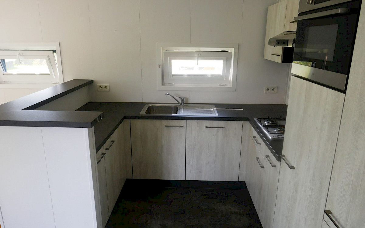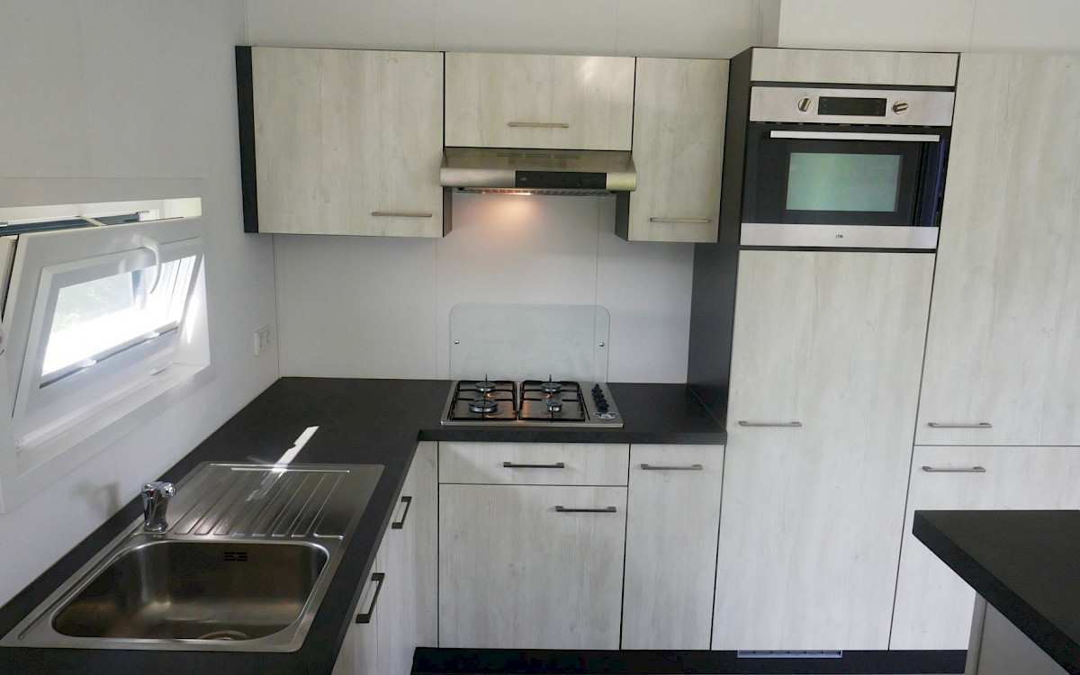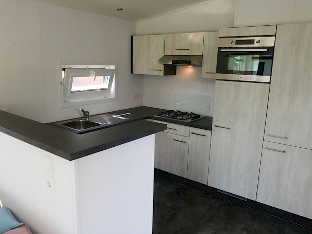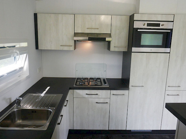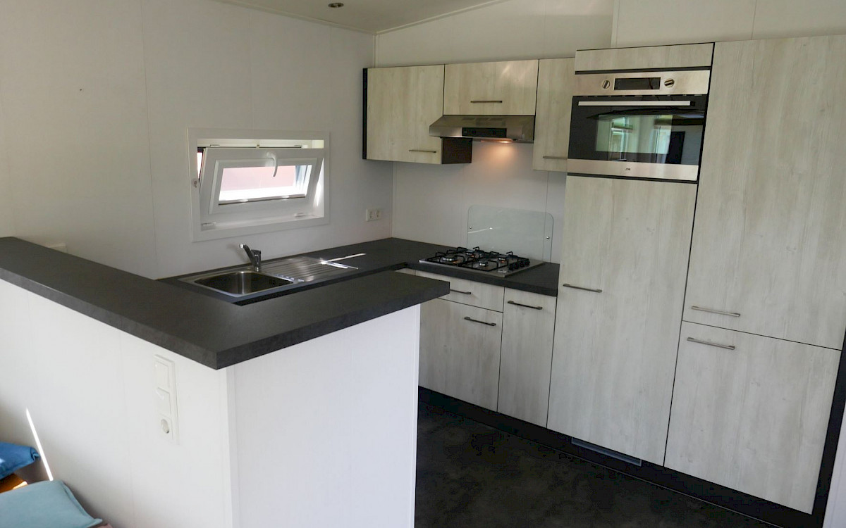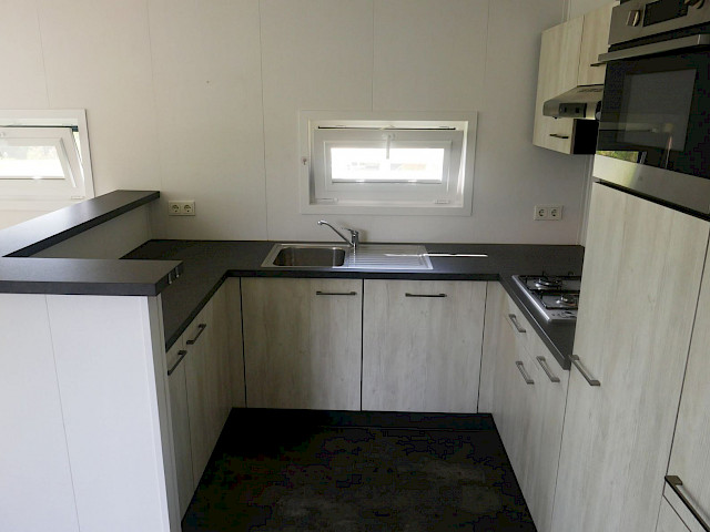 Het heeft een fijn woongedeelte met daarin een mooie u keuken, deze is voorzien van een ruime koelkast met vriesvak, combimagnetron, 4 pits kookplaat en vaatwasser.