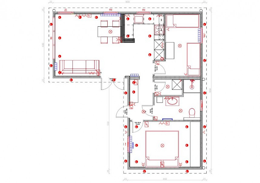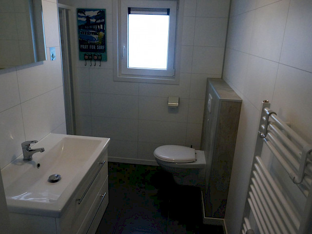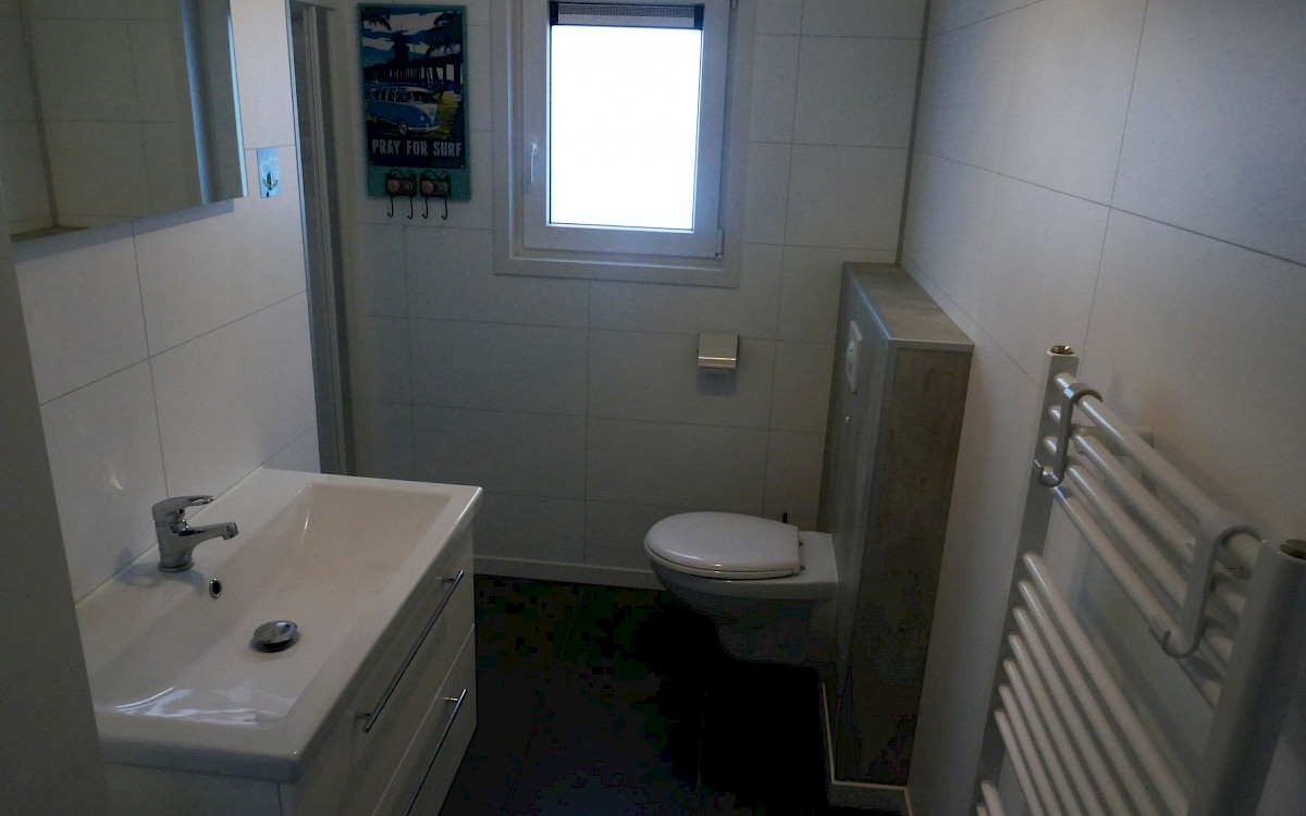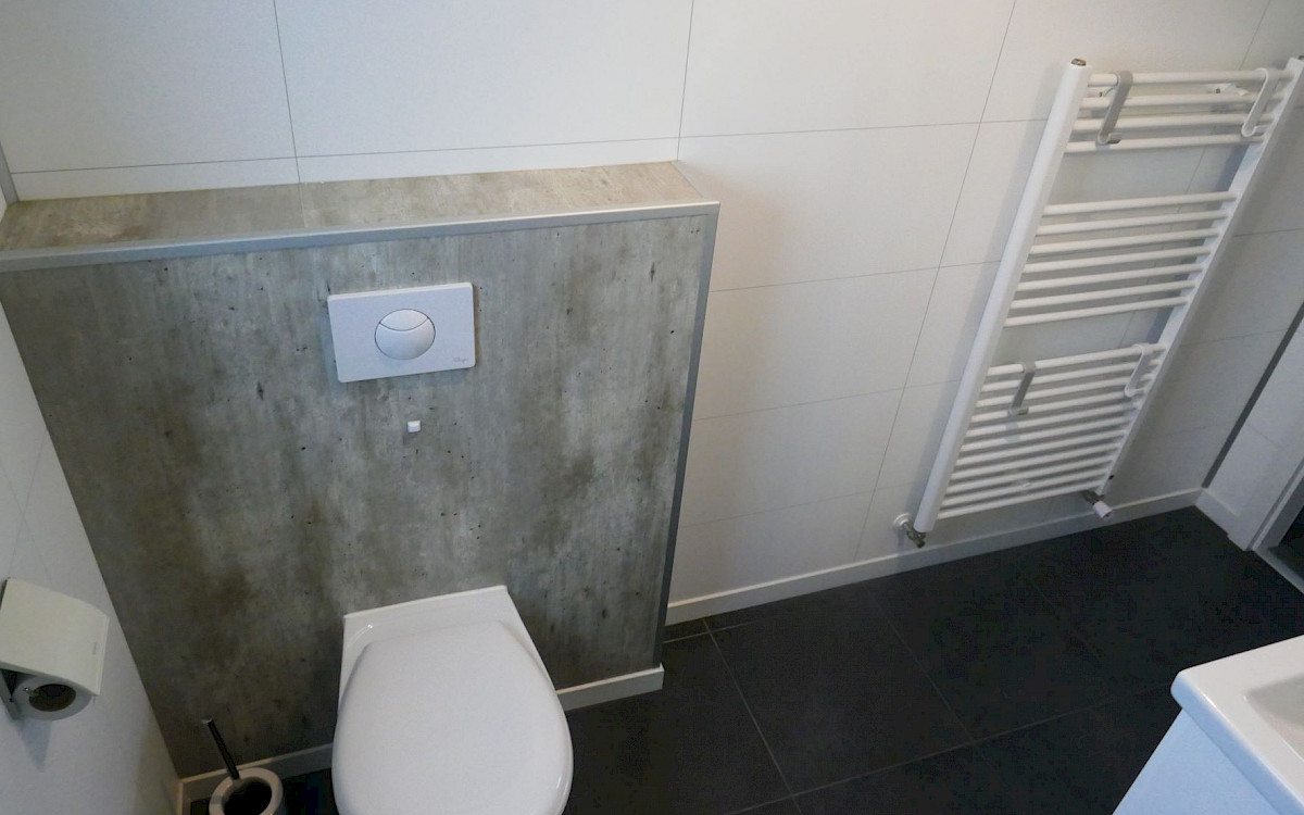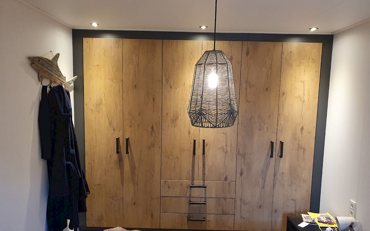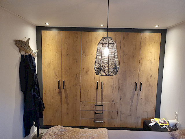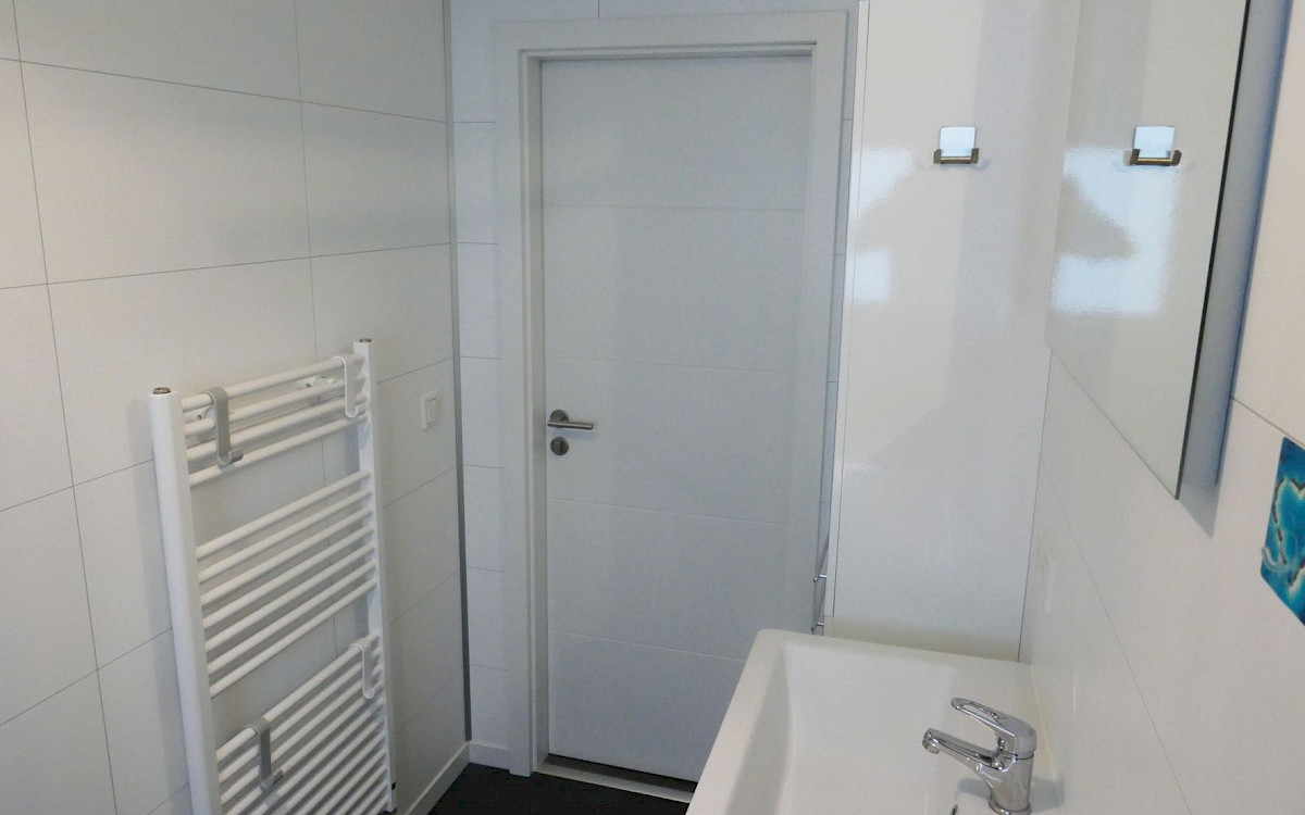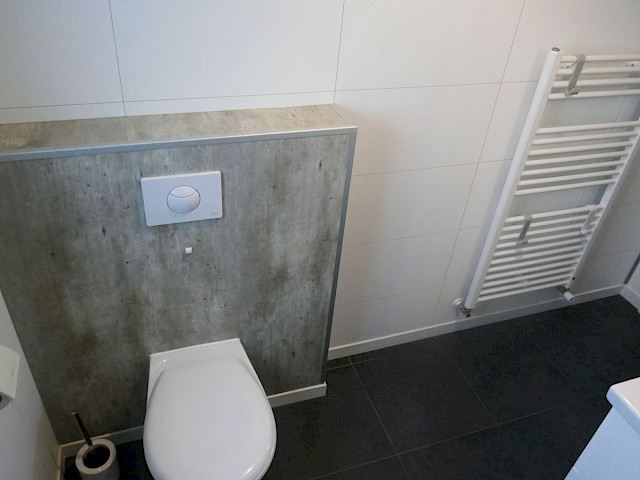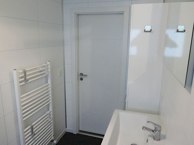 In het korte deel van het chalet bevindt zich de grote slaapkamer met een prachtige kastenwand. Hier aangrenzend bevindt zich een mooie ruime badkamer, met grote douche en hangend toilet.