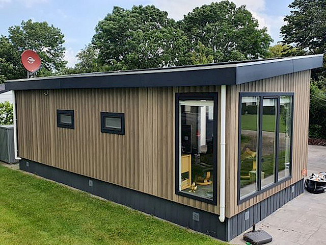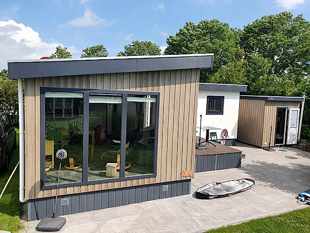 Deze prachtige Da Vinci L model inclusief tuinhuis is te koop( Zonder standplaats ). Het chalet met lessenaarsdak is voorzien van vinylplus houtlook buitenbekleding in combinatie met antracietkleurige kozijnen.