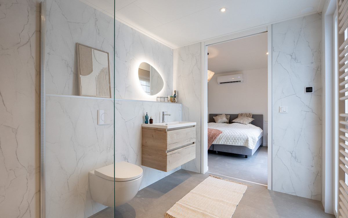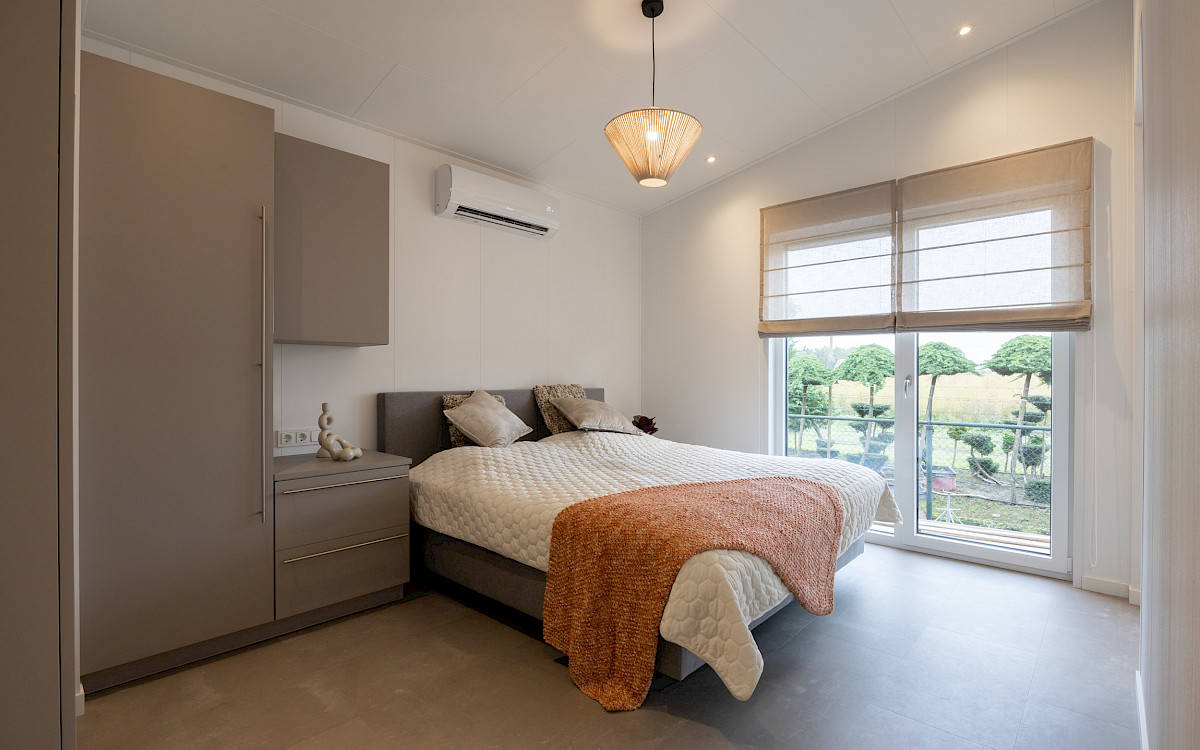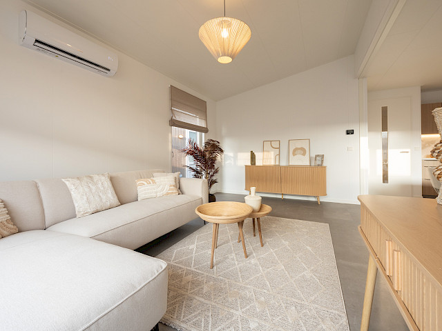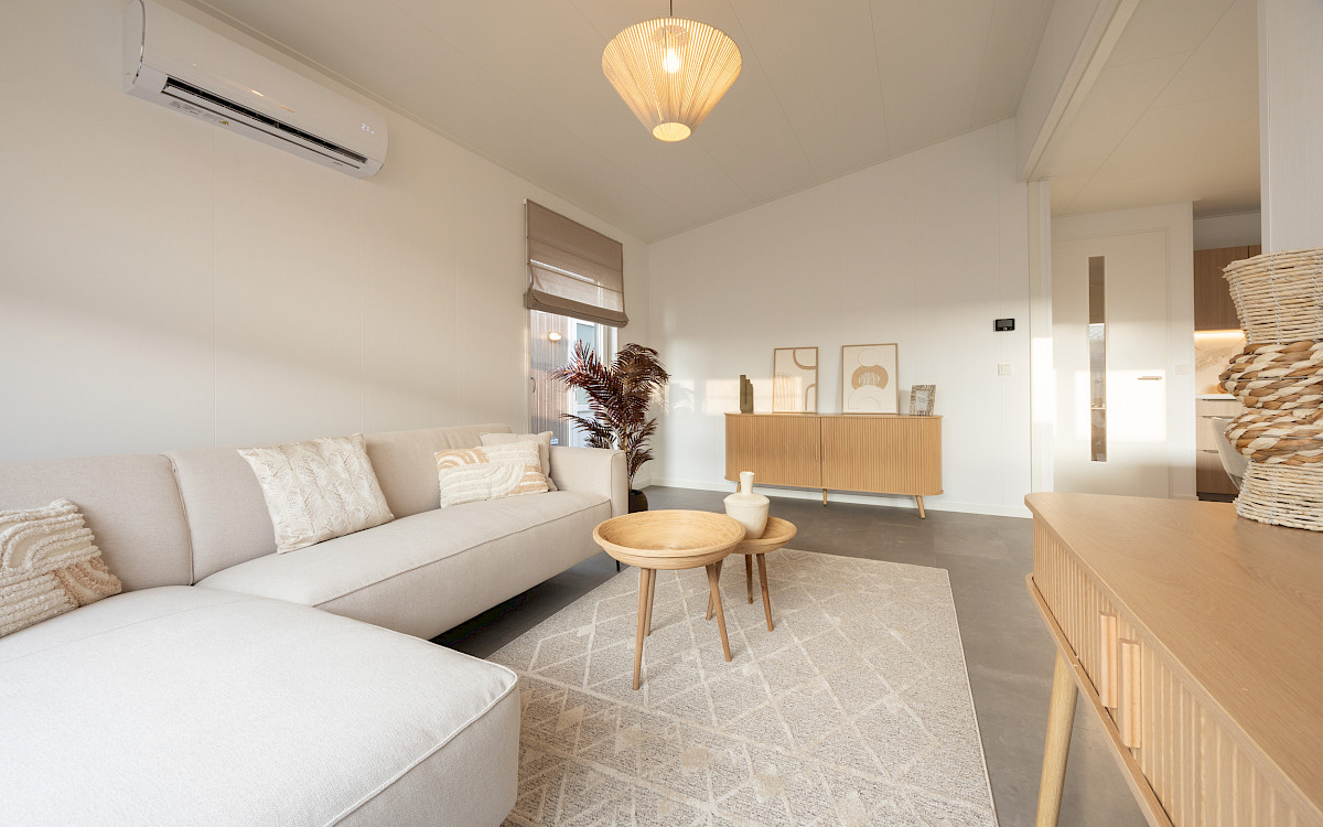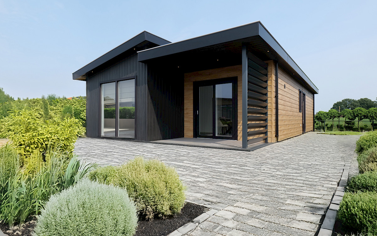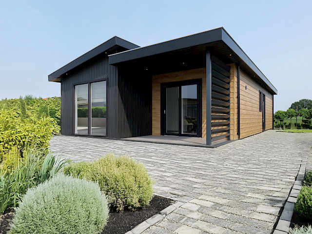 De vernieuwde MZ Lodge 2.0 bestaat uit twee afzonderlijke delen. Wat deze lodge bijzonder maakt, is de unieke indeling, de opvallende dakconstructie en het prachtig geïntegreerde terras met stijlvolle zwarte lamellen. Een combinatie van een plat dak en een lessenaarsdak geeft de MZ Lodge een luxueuze uitstraling. De geïntegreerde veranda zorgt ervoor dat het binnen- en buitenleven naadloos in elkaar overgaan. Dankzij de slimme indeling, met ruime leefruimtes en een duidelijke scheiding tussen privé- en gemeenschappelijke ruimtes, wordt optimale privacy gewaarborgd. Daarnaast is de woning efficiënt ingedeeld met royale afmetingen, 2 slaapkamers en een extra ruimte voor de wasmachine en droger.