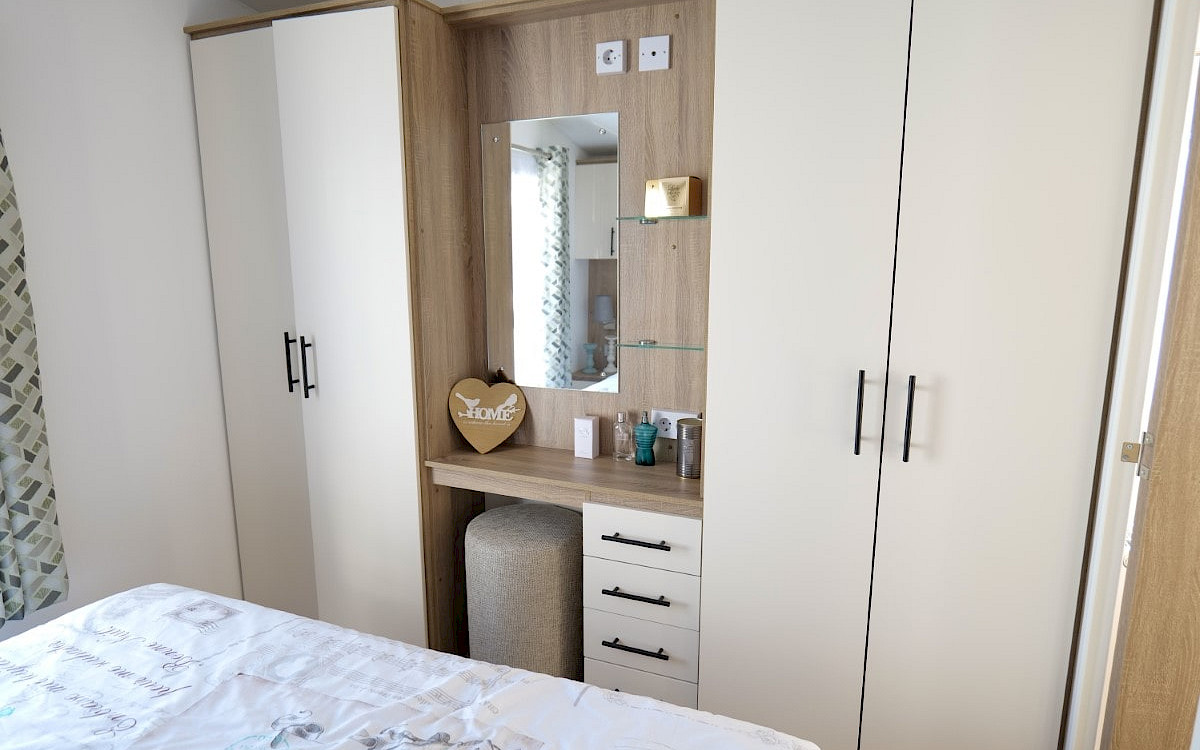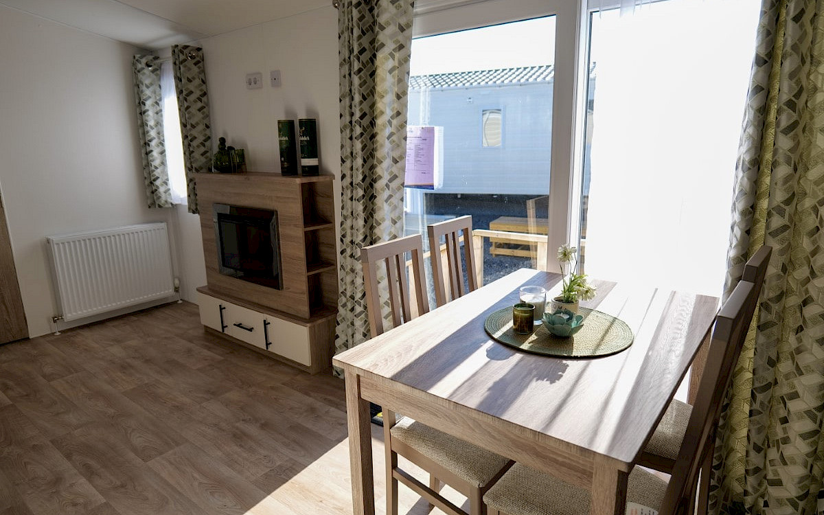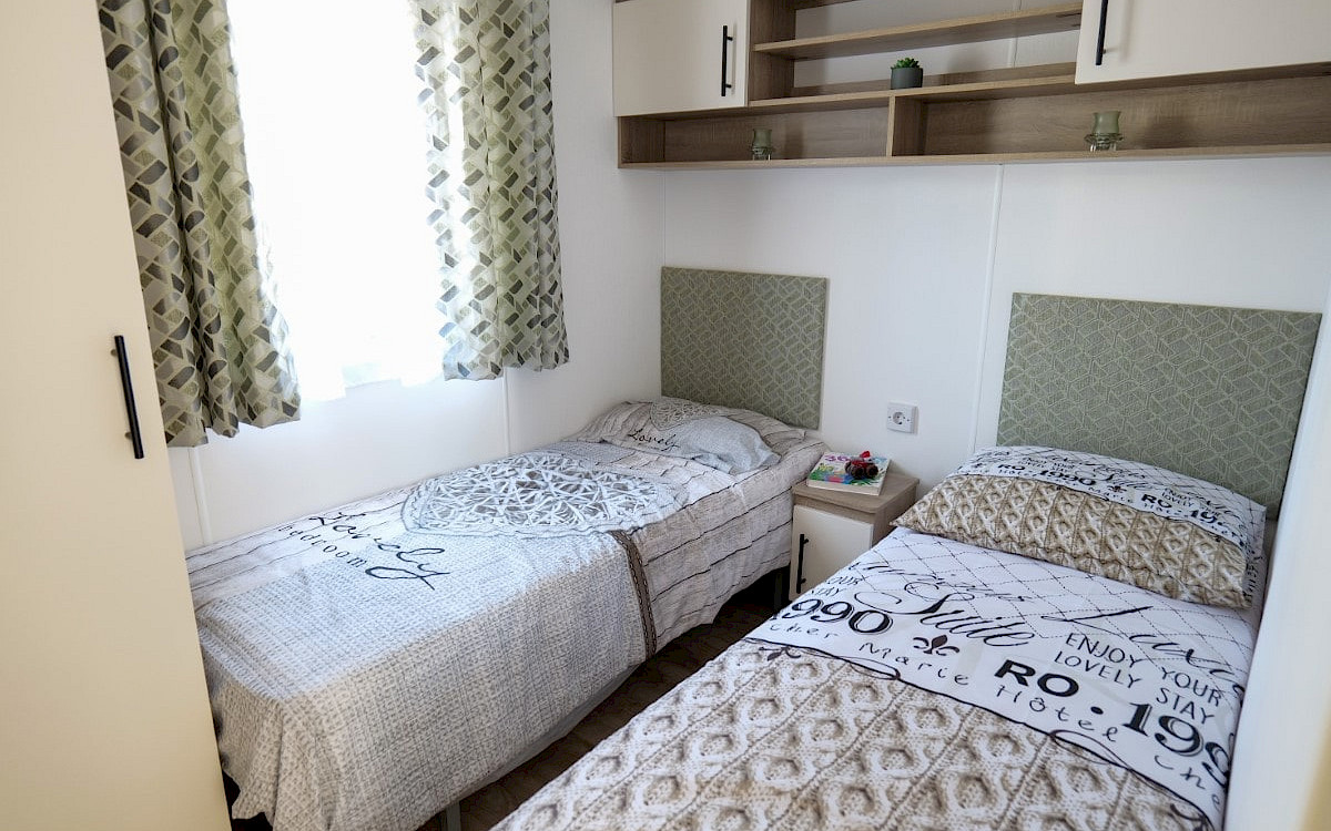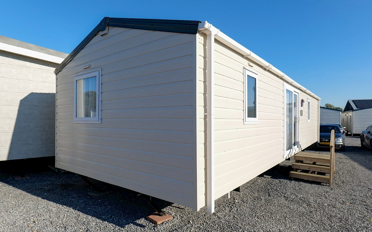 Kenmerkend aan dit model is de grote schuifdeur in het midden van de stacaravan. De Jura beschikt over een centrale woonkamer met een zeer moderne en complete U-keuken. Standaard beschikt de Jura over twee ruime inloopkasten waar u al uw spullen in kunt opbergen. Beide slaapkamers bevinden zich aan weerszijde van het chalet. Dit kan de ideale uitkomst zijn voor gezinnen die overdag graag samen zijn en ‘s avonds meer privacy wensen.