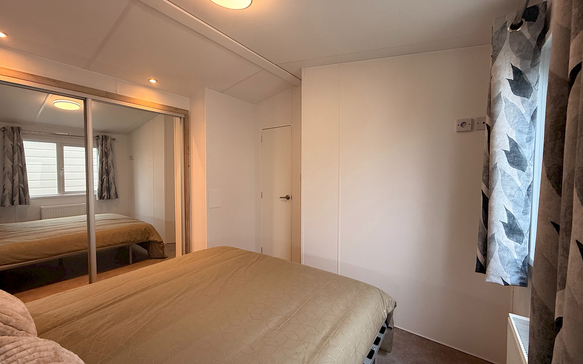 Op bovenstaande afbeeldingen wordt volgend model getoond: 1100 x 400 - 2 slaapkamers. Met toegepaste opties: schuifdeur lange zijde en een vaatwasser. Met een totaal prijs van: €64.843,-