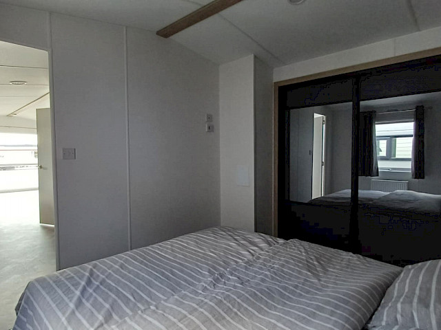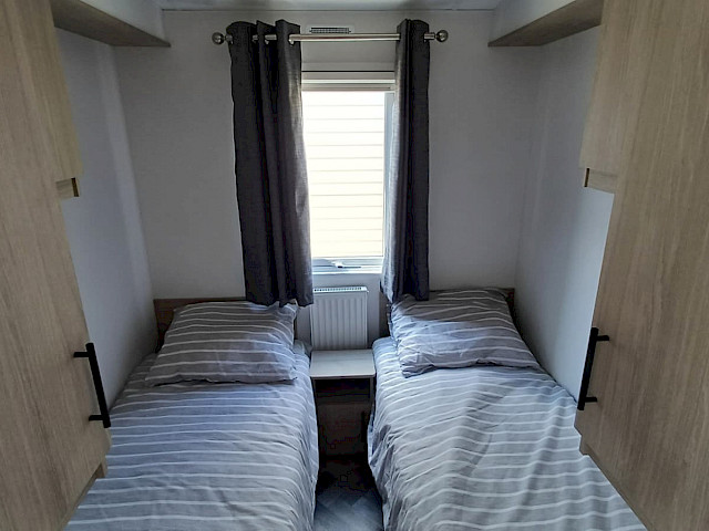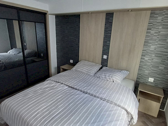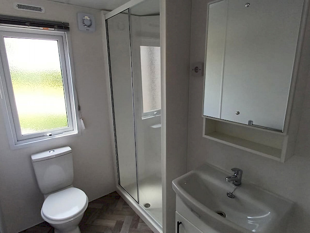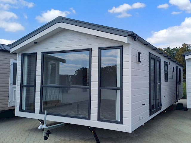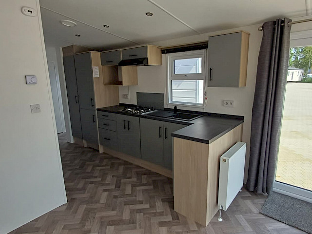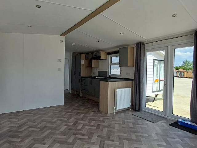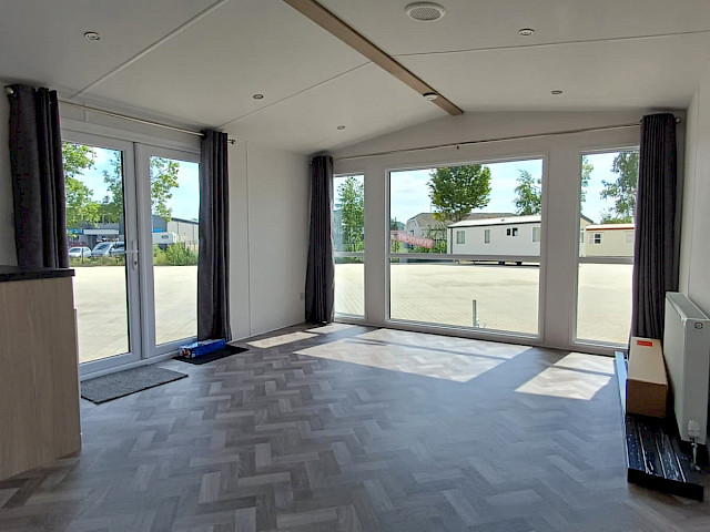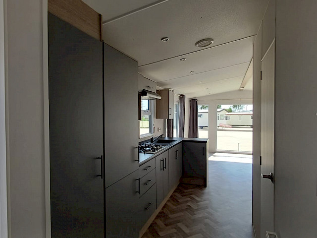 De Ocean stacaravan biedt alles wat u nodig heeft voor een comfortabel verblijf. De grote ramen en terrasdeuren zorgen voor een overvloed aan natuurlijk licht en een naadloze overgang naar buiten. De stijlvolle vinyl vloerbekleding in visgraatmotief geeft een moderne en warme uitstraling. De L-vormige keuken met elegante zwarte accenten is voorzien van een 4-pits fornuis en een ingebouwde koel/vries combinatie. Verder biedt de Ocean twee slaapkamers met voldoende opbergruimte en een badkamer met een ruime douchecabine en een toilet.