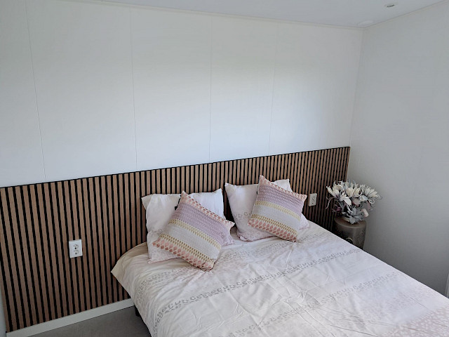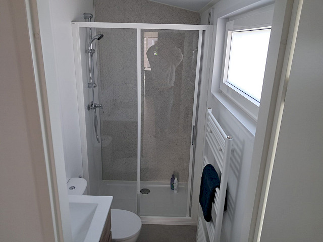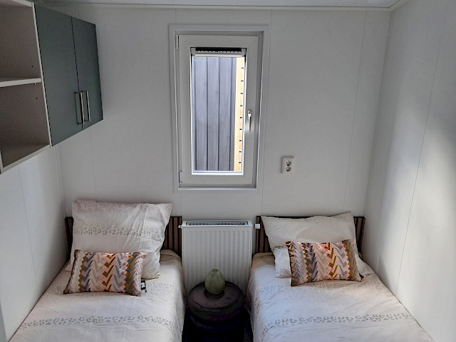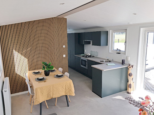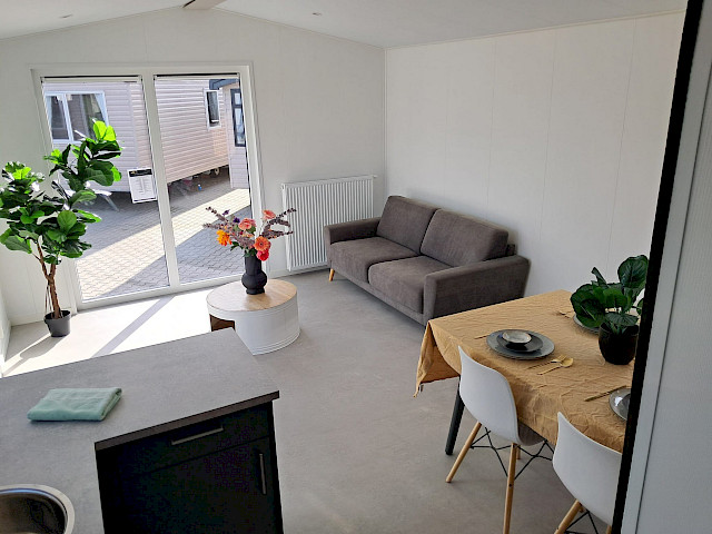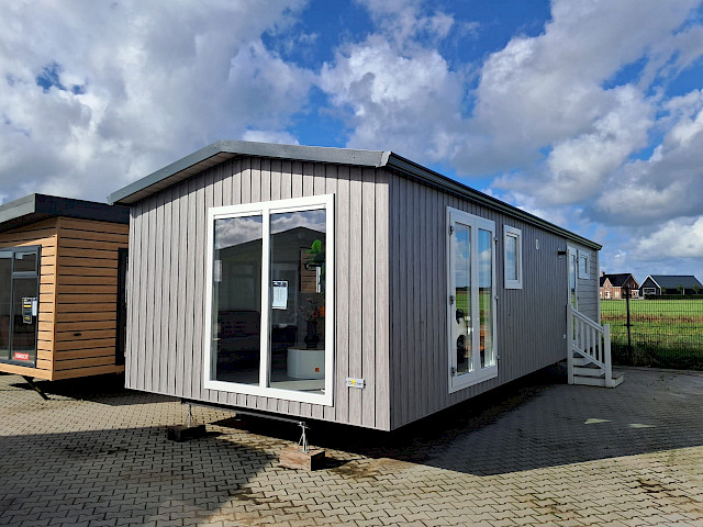 Dit nieuwe model chalet, onderdeel van de Volente-serie, valt op door het prachtige zadeldak met meelopend plafond, wat zorgt voor een ruimtelijk gevoel en een overvloed aan natuurlijk licht. De buitenkant is afgewerkt met VinylPlus-bekleding, wat bijdraagt aan een moderne, strakke uitstraling.