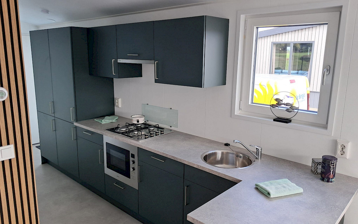 Binnen vindt u een uitgebreide keuken die volledig is uitgerust met moderne apparatuur en voldoende opbergruimte. De grote voorramen, die tot aan de grond reiken, zorgen voor een panoramisch uitzicht en een prachtige lichtinval.