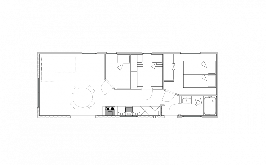 Op bovenstaande afbeeldingen wordt volgend model getoond: 1100 x 400 - 2 slaapkamers met toegepaste optie: accentwand en een L-keuken. Met een totaal prijs van: €81.209.