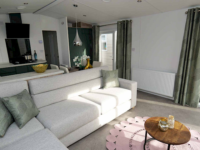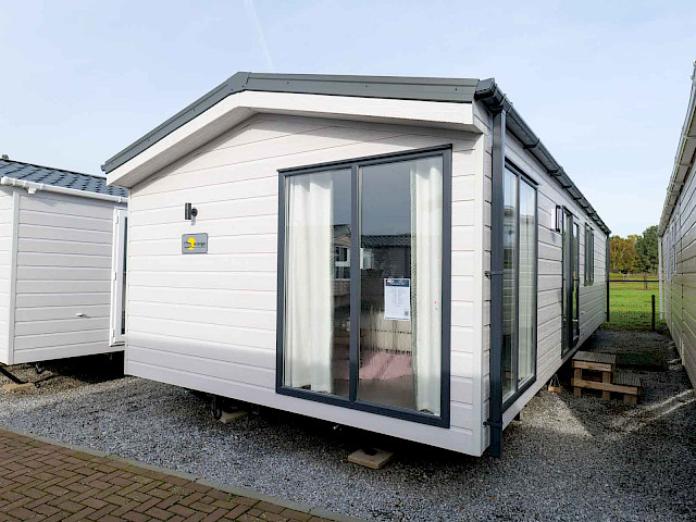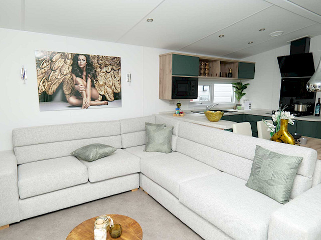 La série Bergjes spéciale Atlantis est un bel ajout à notre gamme. Ce modèle présente un revêtement extérieur gris clair avec des cadres anthracite. La cuisine a une couleur vert foncé chic et est équipée d'une bande LED ! Le grand canapé d'angle est parfait pour une agréable soirée entre amis ou en famille. Et les grandes fenêtres d'angle offrent une belle vue sur votre parc de vacances. Le séjour est séparé des chambres, de la salle de bain et des toilettes séparées par une porte communicante. Bref, la maison de vacances idéale ! Curieux? Venez vite découvrir ce modèle sur notre terrain d'exposition.