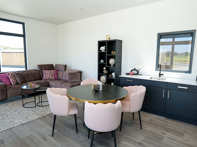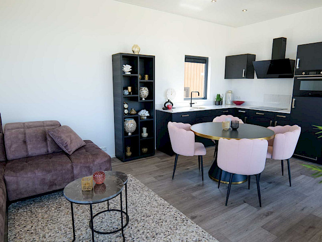 Vous pouvez personnaliser ce chalet à votre guise en choisissant, par exemple, une cuisine de couleur différente ou un plan de travail différent. Vous êtes également libre de choisir un autre sol ou un autre revêtement extérieur. Vous êtes curieux ? N'hésitez pas à visiter notre site d'exposition et à profiter de ce chalet de rêve dès 3 mois.