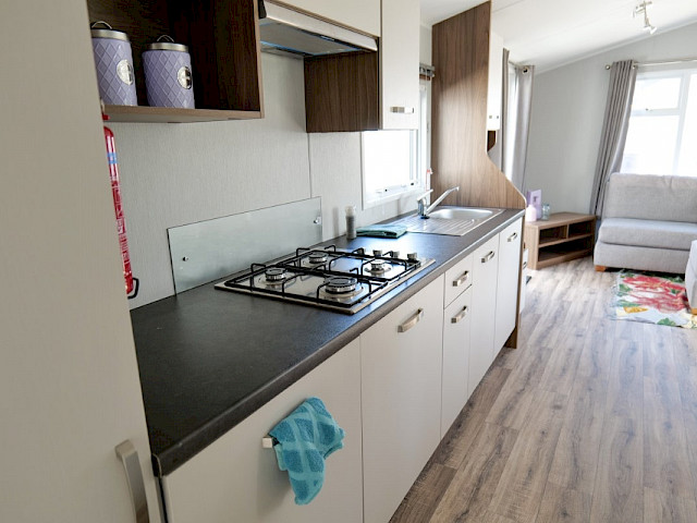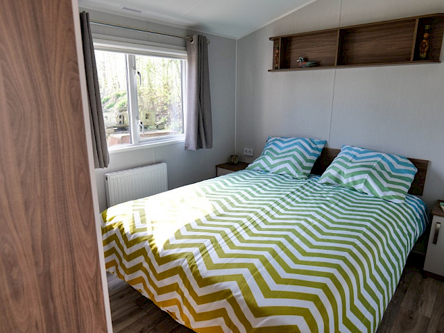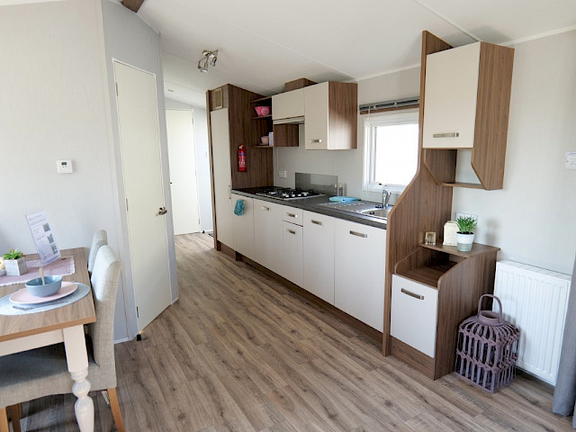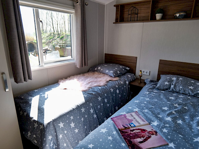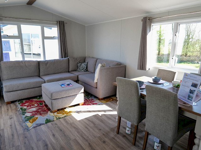 Lorsque vous choisissez le pack de meubles Willerby Lumic, vous obtenez des rideaux gris dans les chambres, des rideaux colorés dans le salon, une table à manger avec 4 chaises, un canapé-lit, un pouf, un meuble TV et une table basse.