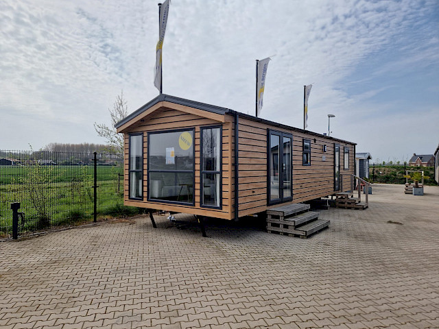 Op bovenstaande afbeeldingen wordt volgend model getoond: 1100 x 370 - 2 slaapkamers. Met toegepaste opties vinylplus buitengevel en antraciete kozijnen en deuren. Met een totaalprijs van €54.297,-.