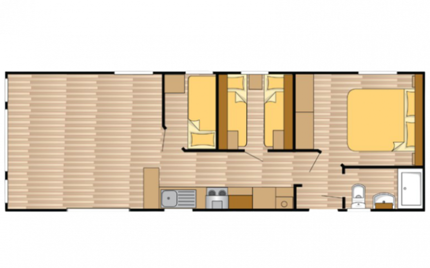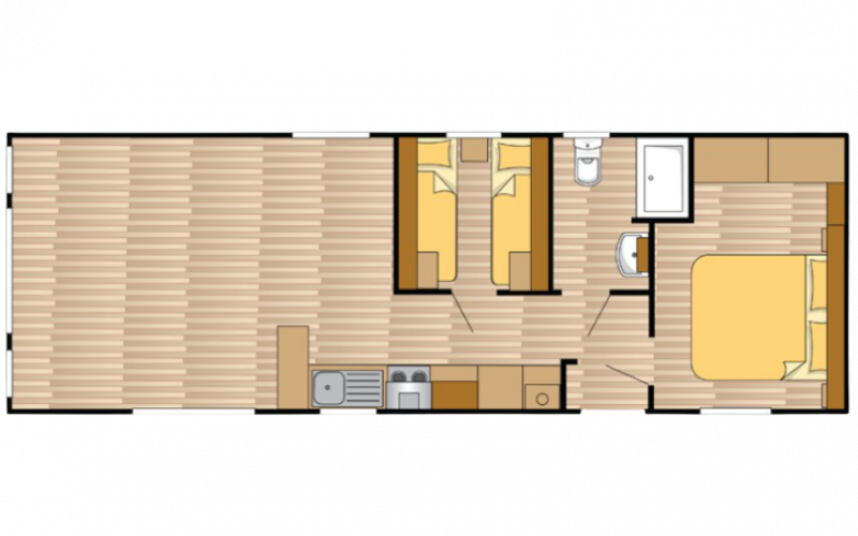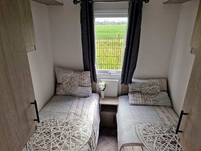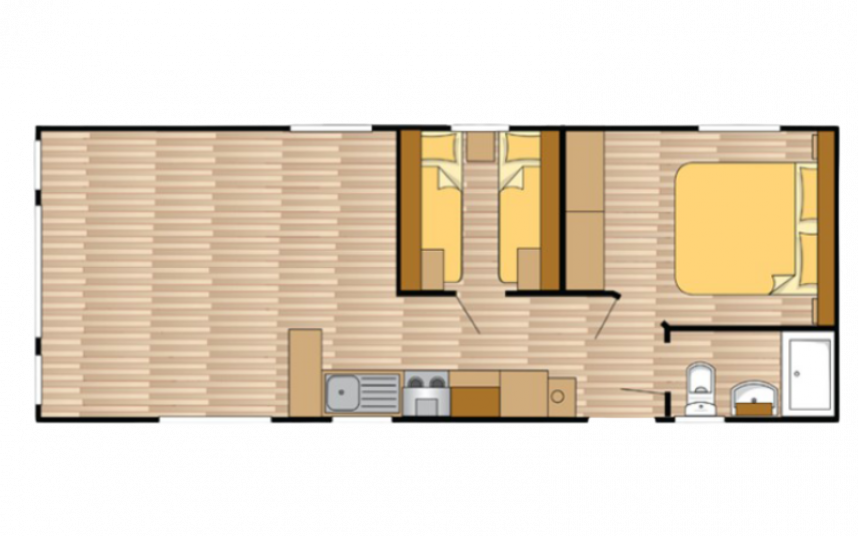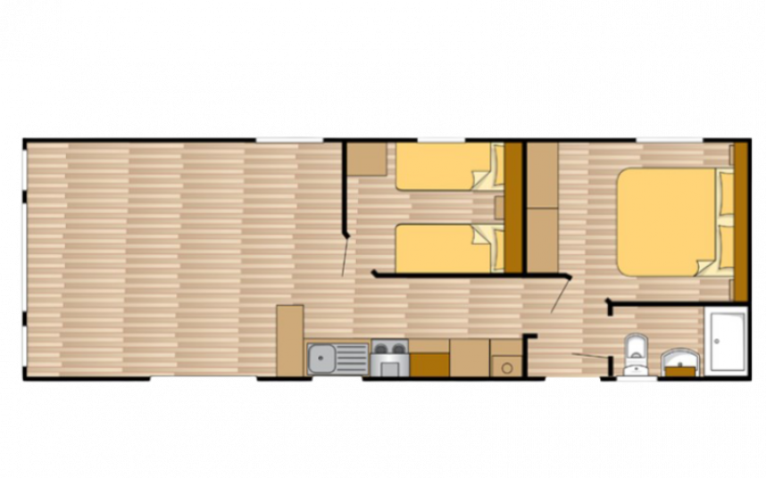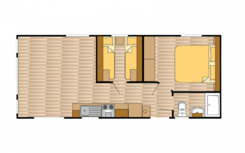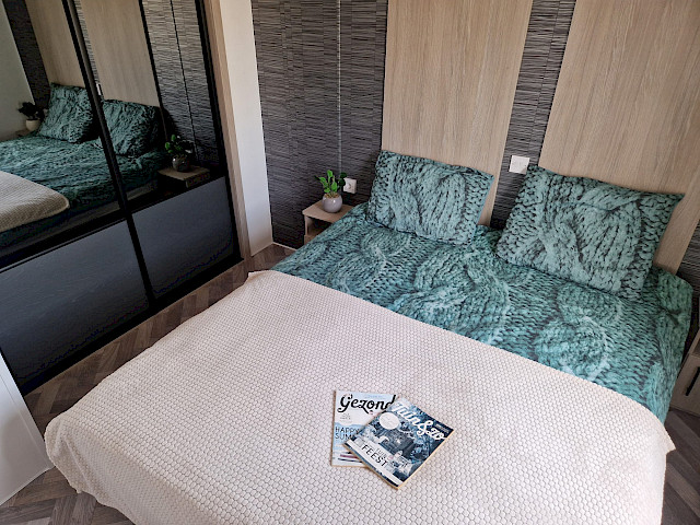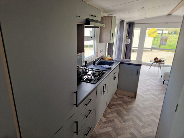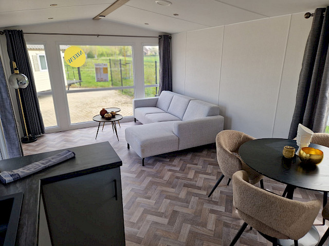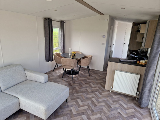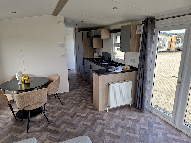 De Ocean stacaravan biedt alles wat u nodig heeft voor een comfortabel verblijf. De grote ramen en terrasdeuren zorgen voor een overvloed aan natuurlijk licht en een naadloze overgang naar buiten. De stijlvolle vinyl vloerbekleding in visgraatmotief geeft een moderne en warme uitstraling. De L-vormige keuken met elegante zwarte accenten is voorzien van een 4-pits fornuis en een ingebouwde koel/vries combinatie. Verder biedt de Ocean twee slaapkamers met voldoende opbergruimte en een badkamer met een ruime douchecabine en een toilet.