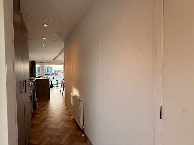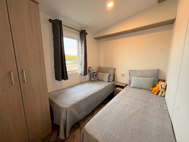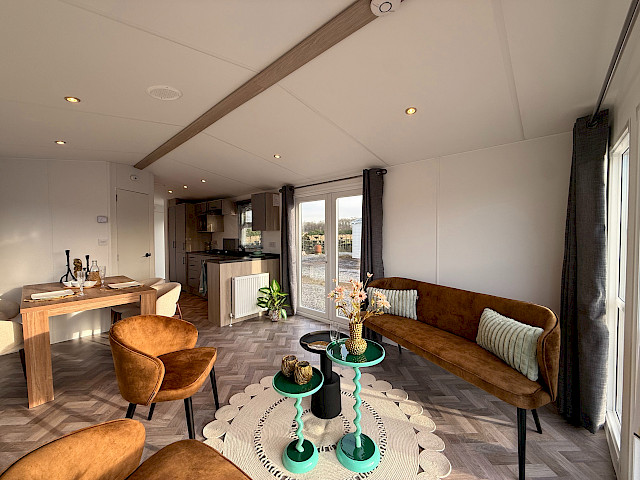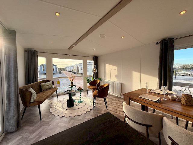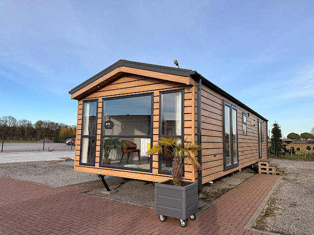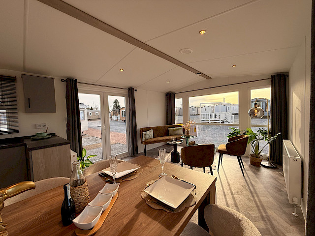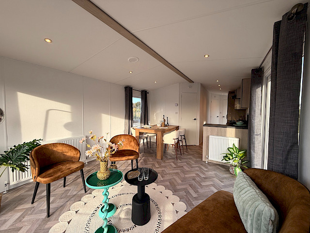 De Bergjes Serie Ocean Vinyplus valt op door zijn grote voorramen, zij-terrasdeuren en het luxe interieur met visgraat vinyl vloer. De moderne L-keuken in taupe kleur is voorzien van een 4‑pits fornuis, ingebouwde koel‑vriescombinatie en optioneel te voorzien van een vaatwasser. Dankzij het meelopend plafond met LED‑spots oogt de living extra ruimtelijk en sfeervol. De stacaravan biedt twee comfortabele slaapkamers en een complete badkamer met ruime douchecabine. Binnen zijn gordijnen en een tv‑aansluiting inbegrepen. De Ocean is afgewerkt met duurzame VinyPlus buitenbekleding, een materiaal dat bekendstaat om zijn lange levensduur en lage onderhoudsbehoefte.