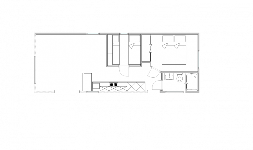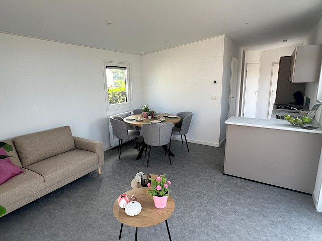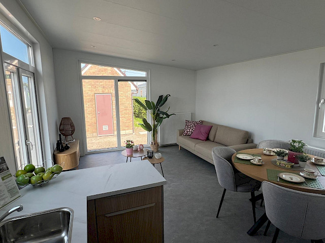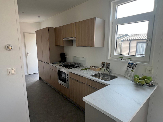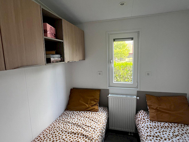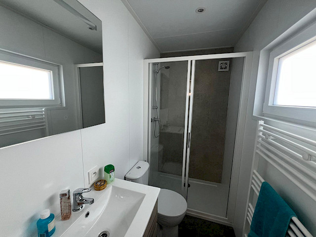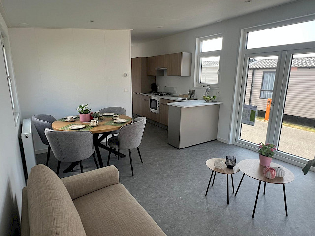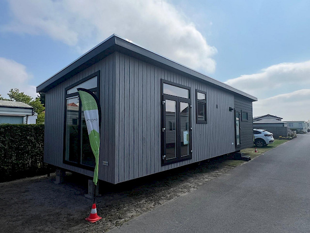 De Volente Deluxe biedt alles wat u nodig heeft voor een comfortabel verblijf. De ruime woonkamer is voorzien van een vinylvloer, grote terrasdeuren en een TV-aansluiting. De L-vormige keuken is van alle gemakken voorzien, met veel opbergruimte, een 4-pits kookplaat, afzuigkap en een ingebouwde koel-/vrieskast. De master slaapkamer biedt een tweepersoonsbed en een ruime kledingkast met schuifdeuren. De logeer-/kinderkamer heeft twee eenpersoonsbedden en handige hangkastjes voor extra opbergruimte. In de moderne badkamer vindt u een stijlvol badmeubel, een design radiator, een toilet en een ruime douchecabine met een tegelmotief op de wand. De chalet is afgewerkt met kunststof buitenbekleding in houtlook, kunststof kozijnen, dubbel glas en centrale verwarming - een perfecte balans tussen comfort en duurzaamheid.