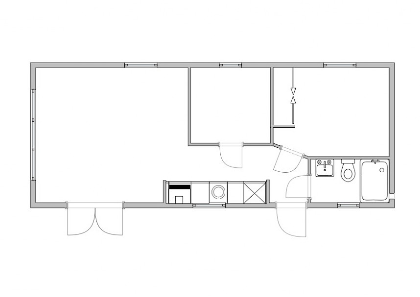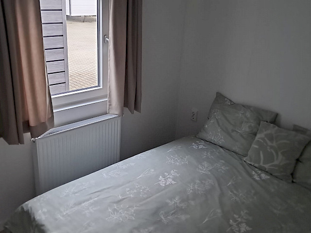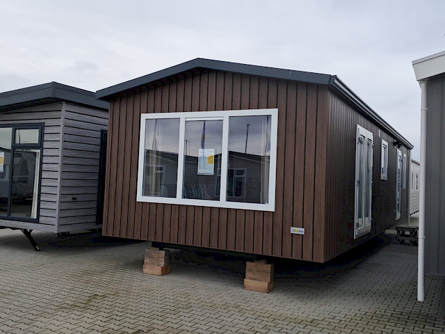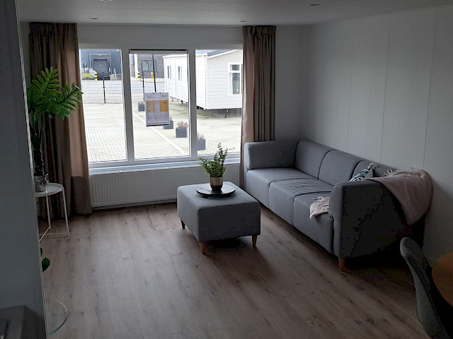 Op bovenstaande afbeeldingen wordt volgend model getoond: 1100 x 400 - 2 slaapkamers, met toegepaste optie: vaatwasmachine, combi oven, bovenkasten in de kleine slaapkamer, boxspringbedden, en een gordijnenpakket. Met een totaal prijs van: €68.670,-