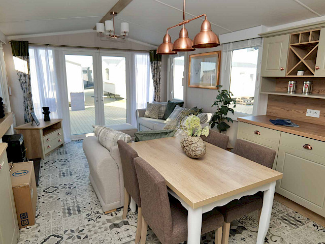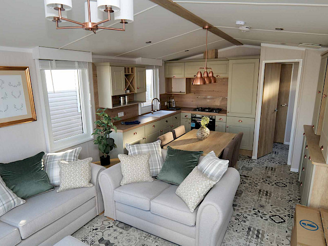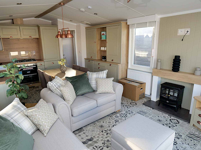 De Swift Vendee is een zeer luxe vakantiewoning van binnen en van buiten. De Vendee is verrassend ruim met de grote woonkamer, hal met kapstok en bank, grote slaapkamer met en-suite badkamer en de tweede slaapkamer. Na het binnentreden in de ruime hal , kom je links kom je in het luxe woon- eetgedeelte terecht. De sofa's zijn heerlijk zacht van materiaal en bieden zo het ultieme comfort. Verder vind je in de woonkamer een televisiepunt en een luxe elektrsiche sfeerhaard. De prachtige keuken met koperen details is rijk ingericht met o.a. een geíntegreede koelvriescombinatie, een magnetron en een geïntegreerd wijnrek! Dit vakantiechalet heeft 2 slaapkamers en 2 volledige badkamers. Op deze manier kun je met gemak met zijn vieren op vakantie.